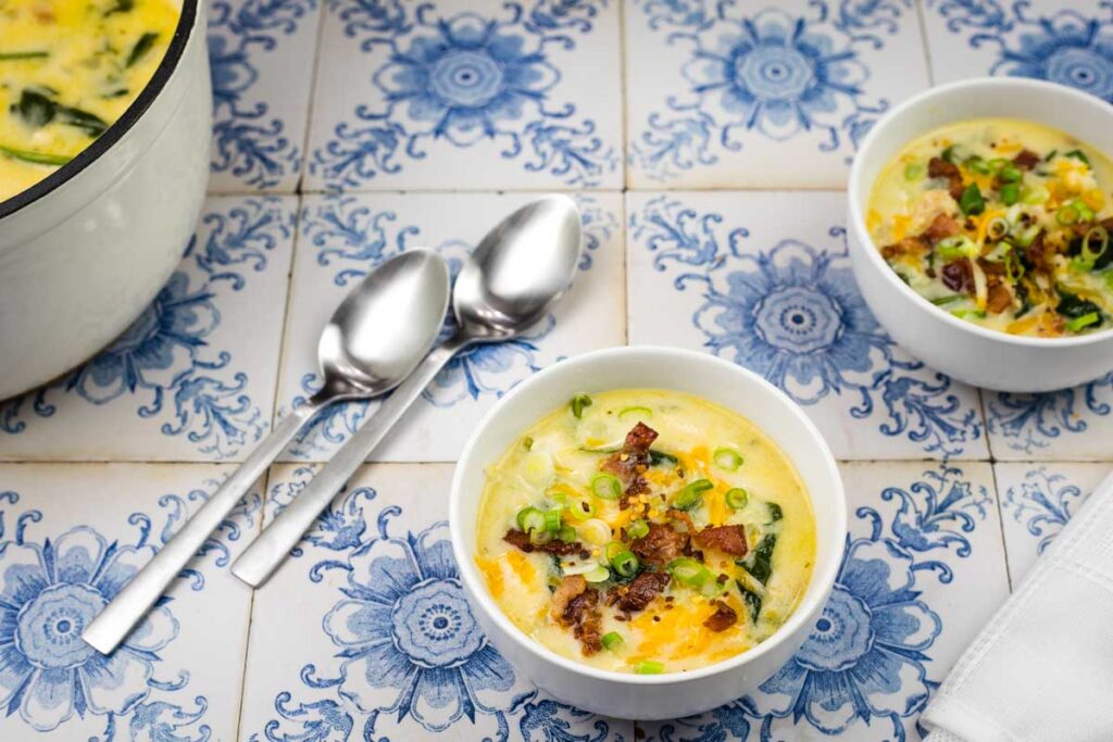 Pour in the heavy cream and stir gently until combined and heated through. Taste and adjust seasoning if needed. Remove from the heat and garnish with the remaining bacon and sliced green onions before serving.